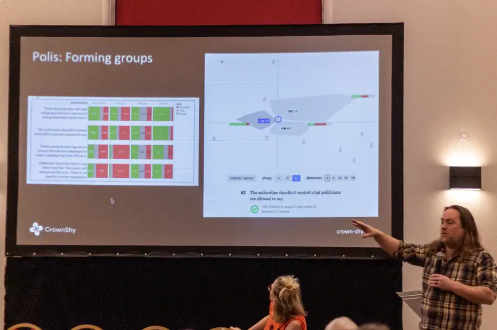 “Polis allows all voters to anonymously suggest statements and for all voters to vote on all statements. Polis then finds the consensus points and the cohorts within a group of people. Polis allows shy people (like me, believe it or not) to ventilate their thoughts. Polis is laser-focussed on finding the very best ideas, not the ideas most shouted about.”